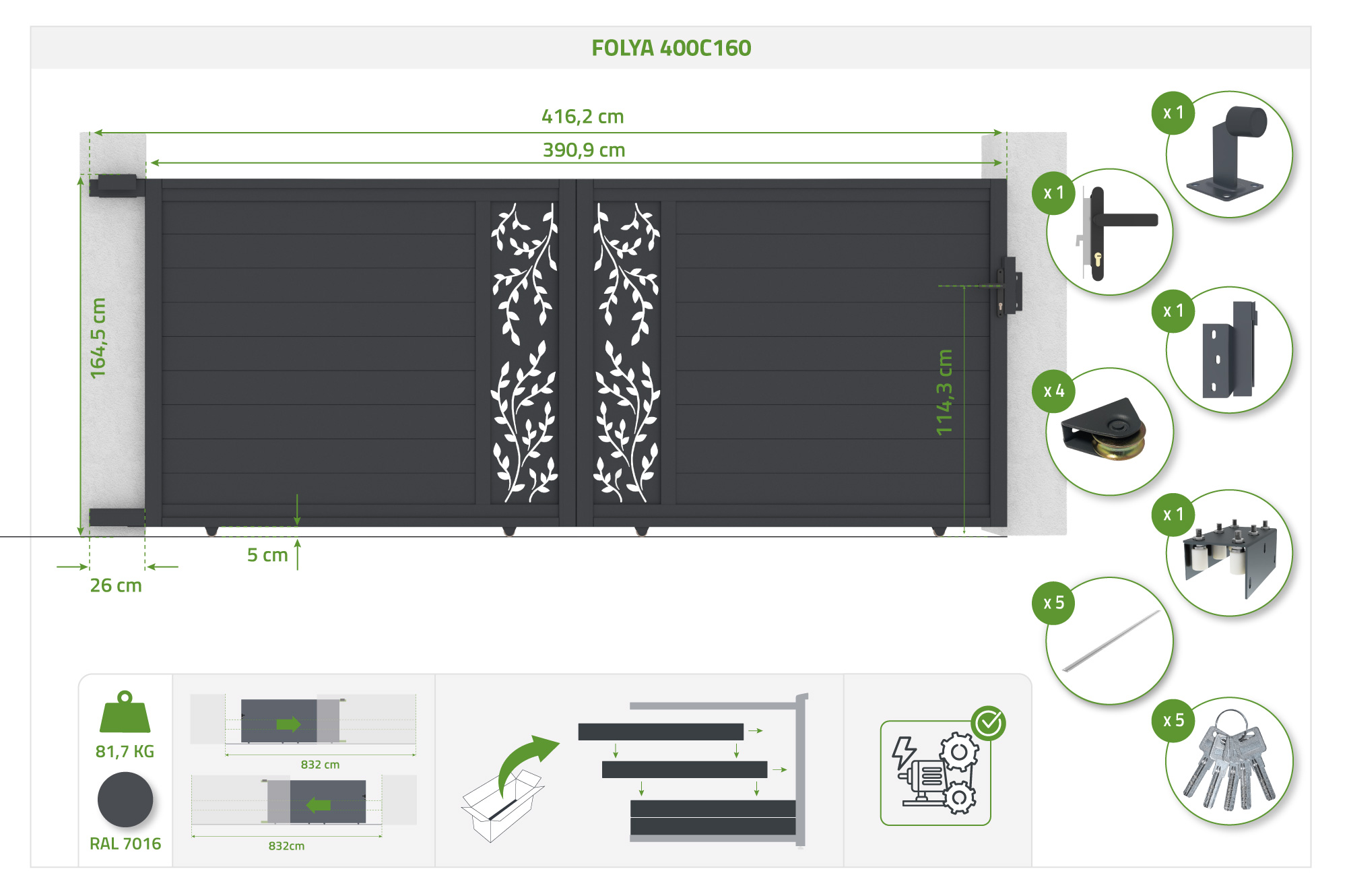 Brama przesuwna FOLYA 4m, wysokość 160cm, szare aluminium