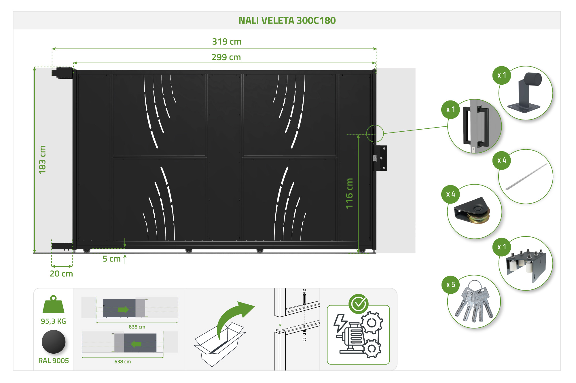 Brama przesuwna NALI VELETA 3m stalowa, wysokość 180cm, kolor czarny